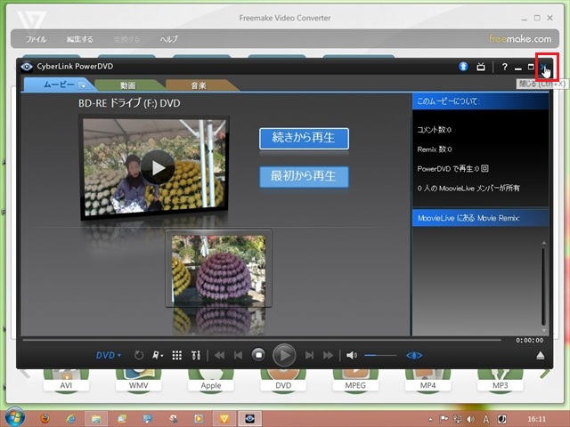 自動的に再生画面が表示されたら、その画面を閉じます。