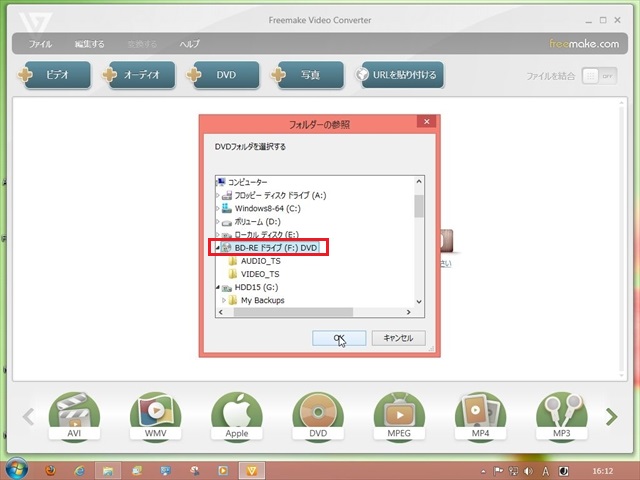 フォルダーの参照画面が表示されるので、DVDドライブを選択します。