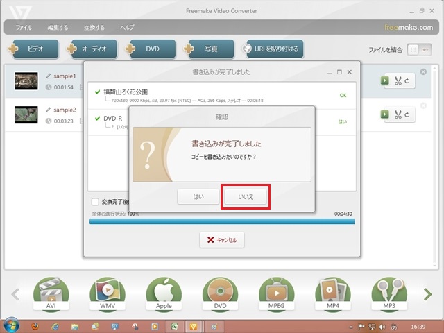 作成が終わると、書き込みが完了しました。と表示されてDVDが排出されます。